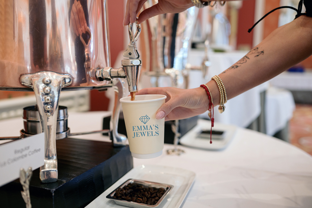 Includes La Colombe coffee, La Colombe decaffeinated coffee and Forte selection of hot teas, dedicated server, branded cups, and 22x28 sign with company logo.