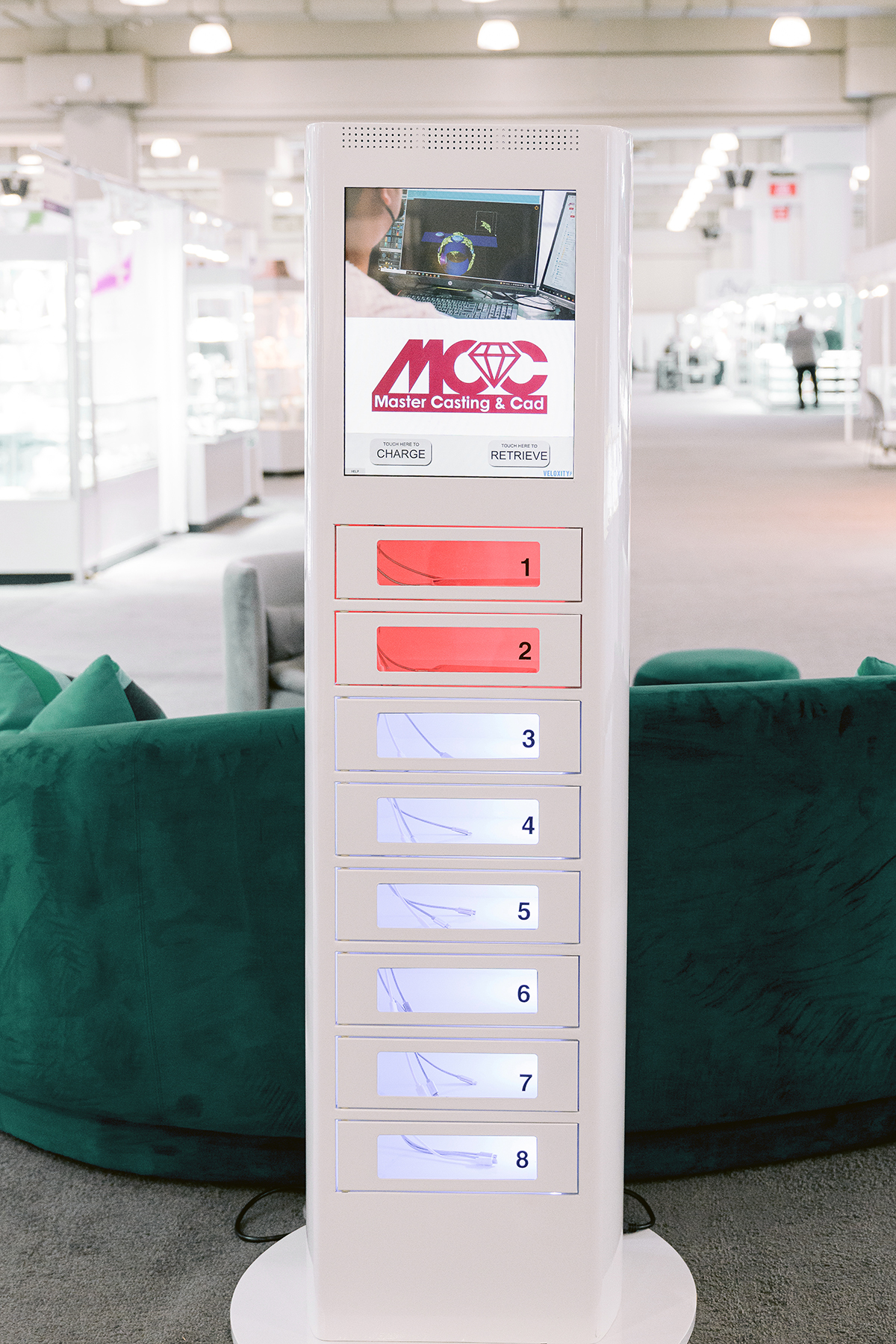 Includes (2) stations with custom branding on display screens with 8 sanitation lockers.